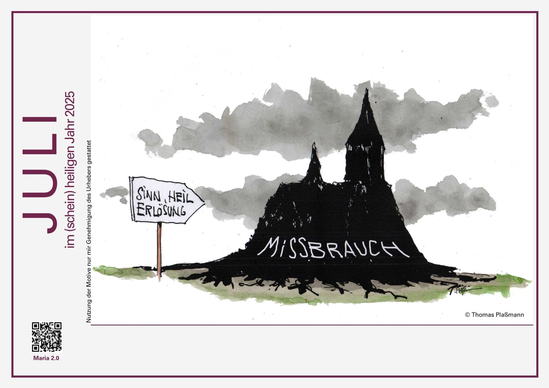Vieles in der römisch-katholischen Kirche ist nach wie vor reformbedürftig, findet Maria 2.0. Mit Hilfe von 12 Karikaturen soll für jeden Monat eine Schräglage der Kirche überspitzt dargestellt werden. In Zusammenarbeit mit verschiedenen Künstlern1 entstand so ein bunter Strauß an witzigen Karikaturen. „Wie so oft bleibt einem aber beim Nachdenken über die Darstellung das Lachen im Halse stecken“, so die Mitglieder der Reformgruppe. „Wir wollen aufzeigen, dass Verantwortliche der Kirche oft Aussagen tätigen, die total schräg sind. Zudem werden Forderungen an Außenstehende formuliert, die im eigenen System selbst nicht umgesetzt werden.“ „Bestes Beispiel“, so eine Mit-Aktivistin, „sind die Aufforderungen des Papstes an politisch Verantwortliche, die Menschenrechte zu achten. Dabei gelten die im eigenen Laden auch nicht!“ Auf diese Doppelmoral will die Aktion zum (schein)heiligen Jahr der Reforminitiative aufmerksam machen – und das einmal nicht mit Streik und Protest, sondern mit unterhaltsamen Karikaturen.